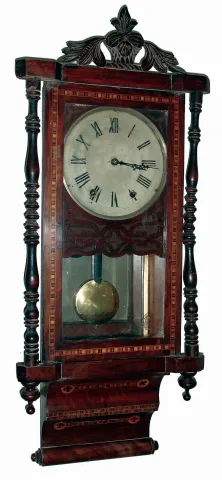 Clocks- 3 (Three) wooden case, 8 days, wall clocks: (1) Waterbury, time and strike, "10" Drop"; (2) Anglo-American time and strike; (3) Waterbury time only oak; c1900 all three have condition problems: (1) the drop octagon has a worn and scratched old finish, and a newer dial; (2) the Anglo-American has a broken column and poor replacement dial, but proper hands and pendulum and nicely inlaid case; (3) the large Waterbury is missing its front door, and has detached case parts; Sold as is, no further details available. Hts 47", 37" and 22"