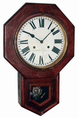 Clocks- 3 (Three) wooden case, 8 days, wall clocks: (1) Waterbury, time and strike, "10" Drop"; (2) Anglo-American time and strike; (3) Waterbury time only oak; c1900