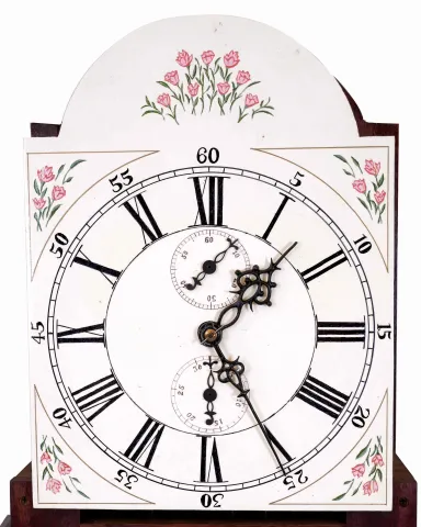 Tall clock, 30 hours, time and strike, Plymouth, Conn. weight driven wooden movement, c1815, in a modern mahogany case with modern painted wooden dial.