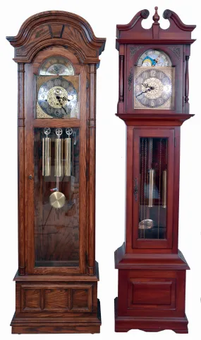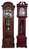 Tall clocks- 2 (Two): (1) Ridgeway, three train and three chimes- Westminster, Whittington and St. Michaels- in an oak case with arched top, c1970; (2) Empire, three train playing Westminster in an cherry case with broken arch top, c1970
