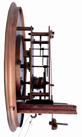 Austrian, single weight, serpentine case, "Vienna Regulator" timepiece, 8 days, c1865 although the top trim is missing, the tail to the minute hand is absent, and the hour hand is changed (does not match), this clock is otherwise in good original condition with nice dark egg shell finish on the case and a perfect porcelain dial. Minor case nicks and blemishes commensurate with age. Ht 40"