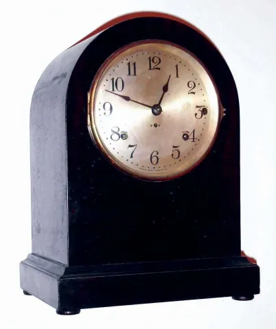 Clocks- 2 (Two) American shelf clocks: (1) Waterbury Clock Co., Waterbury, Conn., "Marson" mahogany and beveled glass 8 days, time and strike crystal regulator, c1917; (2) Seth Thomas Clock Co., Thomaston, Conn., "Chime Clock No. 11", 8 days, time and strike, Westminster chime on four rods mantel clock, c1921. (1) this petite round top case has some small scuffs and scratches, but will restore nicely, and the thick arched beveled glasses on the front and back are fine. The white porcelain dial, with its cast gilt bezel, is pristine. The signed rack and snail movement ticks and strikes, but the pendulum is incorrect (from an old Seth Thomas and worth about $50) so will not work with this clock. Ht 10 1/4" (2) Mahogany veneered case in as found condition in original grungy finish with some minor scratches. Original silvered dial has some tarnished areas. Hands are original. Movement is signed. Ht 13 3/4".