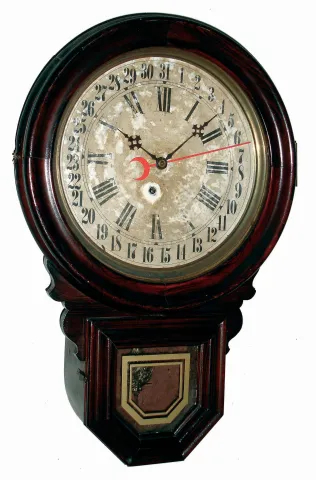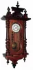 Clocks- 2 (Two), 8 days, wood case wall clocks: Ingraham "Dew Drop" rosewood-grained time and calendar; Junghans German walnut, time and strike, spring wound with unusual keyhole-style front door; early 20th century