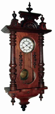 Clocks- 2 (Two), 8 days, wood case wall clocks: Ingraham "Dew Drop" rosewood-grained time and calendar; Junghans German walnut, time and strike, spring wound with unusual keyhole-style front door; early 20th century the Dew Drop dial is quite worn, but the rest mostly is old and original, with a rear paper label. The German regulator has been nicely refinished, has a nice dial, and retains all its fancy woodwork. Neither was tested, sold as is with no further details available. Hts 40 1/2" and 23 1/2"