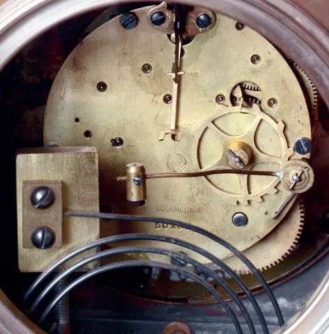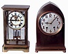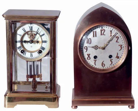 Clocks- 2 (Two): (1) Ansonia Clock Co., Ansonia, Conn., "Prism', 8 days, time and strike, spring driven brass movement crystal regulator shelf clock, c1905. (2) Seth Thomas Clock Co., Thomaston, Conn., "Gothic No. 1", 15 day, time and strike, spring driven brass movement mantel clock, c1913. (1) Polished brass case in nice clean condition. Original porcelain dial has a hairline crack at each winding arbor. Original hands and pendulum. All the beveled glass panels are fine. Rack striking movement is signed. (2) Polished bronze case in nice condition. Original silvered dial with raised bronze numerals has a couple dark streaks, but is otherwise pretty clean. Original hands.