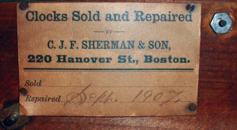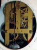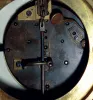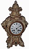 (1) the floral and cobalt-blue painted case is in nice undamaged condition with light crazing on the fired surface. The thick beveled glass is fine as is the fancy pierced brass grill over darkened paper dial. Rear door is a crude replacement, front bezel does not stay closed. The movement will need service. Ht 11 1/4" (2) the very ornate and detailed case needs cleaning but appears to have no losses or damage. The white porcelain dial and convex glass are fine. The stamped movement ticks, but the strike mainspring is broken and will need service. Ht 14 1/2"