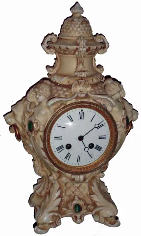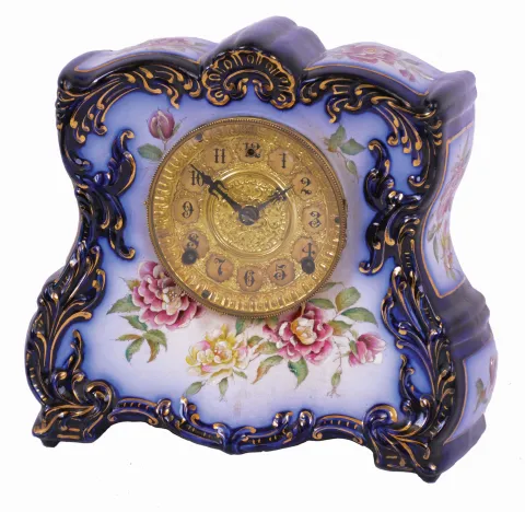 Clocks- 2 (Two): (1) William L. Gilbert Clock Co., Winsted, Conn., "No.410", 8 days, time and strike porcelain mantel clock, c1898; (2) French cast porcelain figural, 8 days, time and strike mantel clock, Japy Freres Medaille d'Honneur bell-striking movement, c1890 (1) the floral and cobalt-blue painted case is in nice undamaged condition with light crazing on the fired surface. The thick beveled glass is fine as is the fancy pierced brass grill over darkened paper dial. Rear door is a crude replacement, front bezel does not stay closed. The movement will need service. Ht 11 1/4" (2) the very ornate and detailed case needs cleaning but appears to have no losses or damage. The white porcelain dial and convex glass are fine. The stamped movement ticks, but the strike mainspring is broken and will need service. Ht 14 1/2"