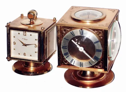 Clocks- 2 (Two): brass with weather stations, swiveling multidial instruments with 8 day timepieces, hygrometer, barometer, thermometer: Kirby, Paris, with top compass; Imhof Swiss; mid 20th century both are in good original condition with some wear to the lacquered brass finishes. Both jeweled movements tick and set but were not tested long term and the other indicators appear to be functional. Hts. 4 1/2"