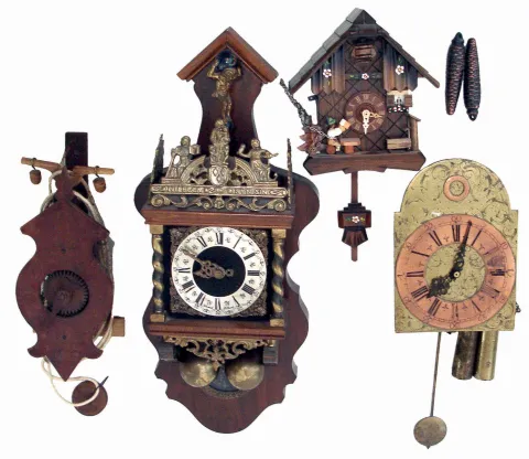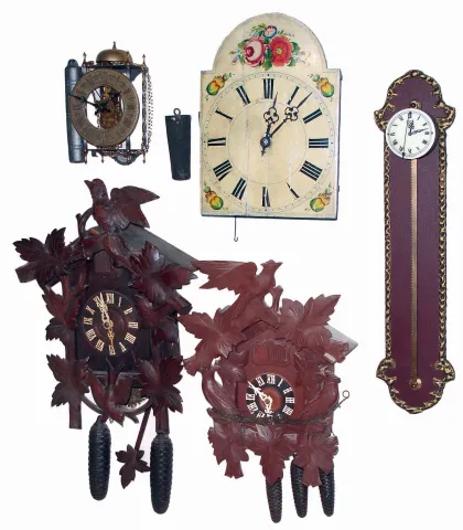 Clocks- 9 (Nine) weight-driven wall clocks: 3 German, 30 hours, cuckoos; Zan Daam reproduction; Gravity; Lantern; Wag-on-Wall; and Columbus; 20th century