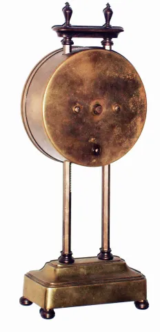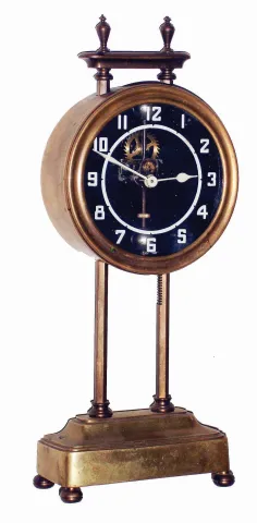 British, 30 hours, brass and glass gravity clock, c1925 the brass case is intact and undamaged, with some darkening of the lacquered surfaces. The reverse painted glass dial is good. The barbell pendulum swings but the escape wheel does not advance, so service will be needed. Ht 10 1/2"