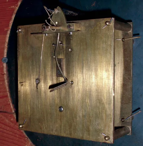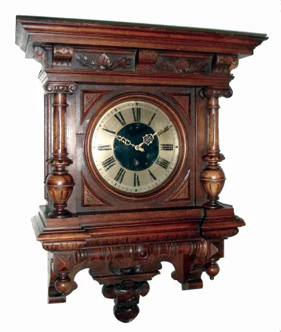 this oversize ornate hanging clock appears complete with an old waxed finish and some shrinkage cracks. There is no sign that there ever was a top cre...