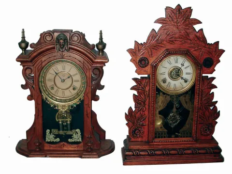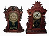 Clocks- 2 (Two) Connecticut, 8 days, time and strike shelf clocks: Gilbert "Laurel" oak with alarm, c1895; Ansonia walnut "Monarch" (with losses) although the Gilbert matches the "Laurel" illustration in Ly, its rear label identifies the clock as "The Boston". Ht 24". It has been nicely refinished, and its original paper dial is only slightly toned. The "Monarch is missing its entire lower section, its top urn, and top side finials (now brass from pillar and scroll). Its original paper dial has toned and faded. Both tick and strike but were not tested long term. Hts. 24" and 19"