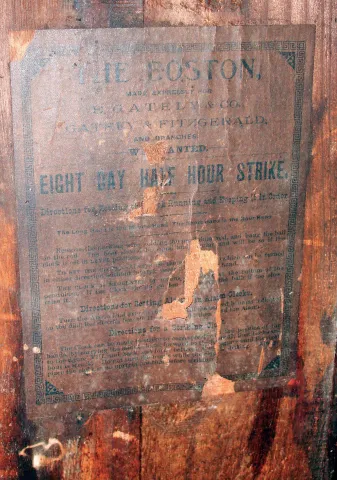 although the Gilbert matches the "Laurel" illustration in Ly, its rear label identifies the clock as "The Boston". Ht 24". It has been nicely refinished, and its original paper dial is only slightly toned. The "Monarch is missing its entire lower section, its top urn, and top side finials (now brass from pillar and scroll). Its original paper dial has toned and faded. Both tick and strike but were not tested long term. Hts. 24" and 19"