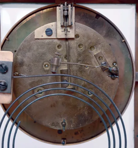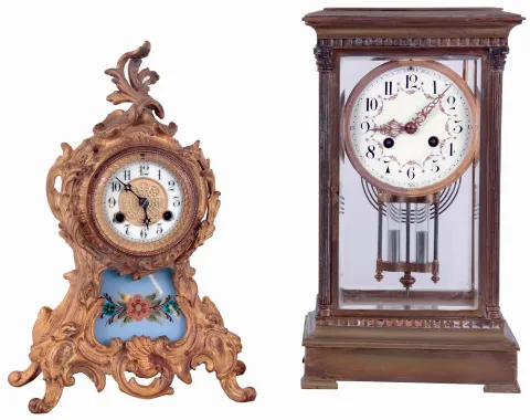 (1) Cast and gilded spelter case. Original porcelain dial is fine with original hands. The glass that attaches to the rear bezel that holds the movement in place has detached and will need attention. Movement is signed. (2) Brass case with some traces of original gilding. Original porcelain dial has some chips on the bottom edge near 6 o'clock. Original hands and pendulum. The pendulum has lost its mercury and now has glass tubes with polished inserts. Both beveled side glass panels have a chip in the corner. The front and back glass panels are fine.