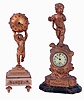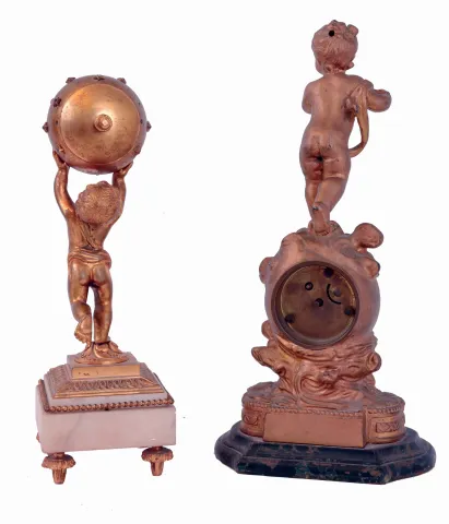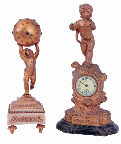 Clocks- 2 (Two): Both desk clocks, one a New Haven on a marbled base supporting a gilt spelter case and surmounted by a putto, enamel dial and 30 hour timepiece, the other French, a gilt putto holding the spherical case above his head, and standing on a