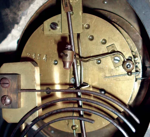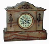 (1) the large and heavy marble case has edge chips and some more serious damage to a lower front corner. It's unsigned movement ticks and strikes but was not tested long term. Ht 17 1/4". (2) & (3) Both anniversary clocks have tarnished brass exteriors, brighter interiors, good dials, and intact torsion springs, but were not tested. (4) the veined marble case is intact with just very minor edge chips. The hand painted dial, with flying cherub, is fine, as is the thick beveled glass. The unsigned movement ticks, with its lever escapement, and strikes but was not tested long term and may need cleaning. Ht 10.75