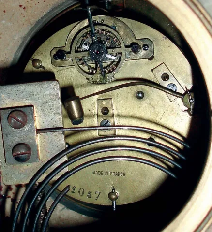Clocks- 4 (Four): (1) large French black marble, 8 days, time and strike mantel clock with visible escapement, c1890; (2) Schatz German square brass and glass 1000 day anniversary clock, c1952; (3) Kundo German brass and glass 400 day, c1965; (4) French