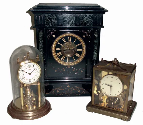 Clocks- 4 (Four): (1) large French black marble, 8 days, time and strike mantel clock with visible escapement, c1890; (2) Schatz German square brass and glass 1000 day anniversary clock, c1952; (3) Kundo German brass and glass 400 day, c1965; (4) French onyx, 8 days time and strike mantel clock, painted porcelain dial, balance platform, c1900 (1) the large and heavy marble case has edge chips and some more serious damage to a lower front corner. It's unsigned movement ticks and strikes but was not tested long term. Ht 17 1/4". (2) & (3) Both anniversary clocks have tarnished brass exteriors, brighter interiors, good dials, and intact torsion springs, but were not tested. (4) the veined marble case is intact with just very minor edge chips. The hand painted dial, with flying cherub, is fine, as is the thick beveled glass. The unsigned movement ticks, with its lever escapement, and strikes but was not tested long term and may need cleaning. Ht 10.75