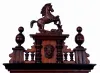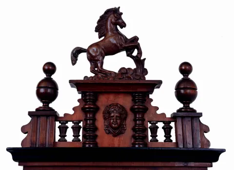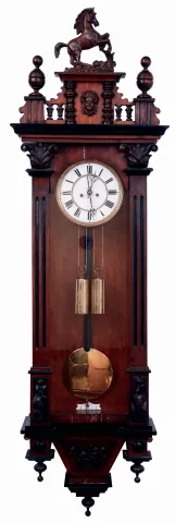 German, 2-weight, gong strike, "Vienna Regulator" in a walnut veneer case and with original top surmounted by a horse, c1875
