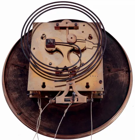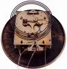 this factory produced clock has no logo, but does have serial # 6374 on the movement, mounting bracket, top of pendulum, rear of dial, and into the to...