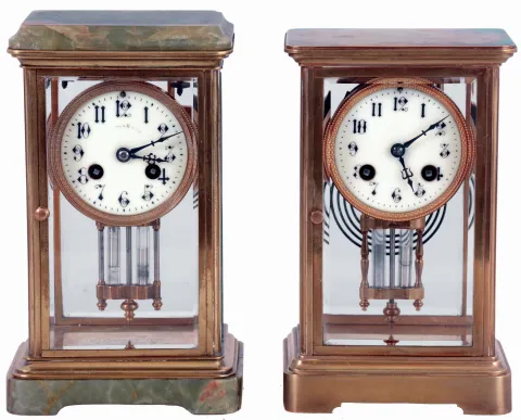 Clocks- 2 (Two): (1) French, Japy Freres, 8 days, time and strike, spring driven brass movement crystal regulator mantel clock. (2) French, 8 days, time and strike, spring driven brass movement brass and onyx crystal regulator mantel clock, both c1905. (1) Polished brass case in nice condition. Original porcelain dial is perfect. Original hands and pendulum. Beveled glass panels are perfect. (2) Brass and onyx case has a piece of the onyx missing at the back of the base. The top is detached from the case with some damage to one corner. Porcelain dial is perfect with loss of the name of the retailer. Original hands and pendulum. Beveled glass panels are fine. Engraved on the base reads: "Christmas 1907 / Presented to F. Anderson Coulter / By The / EMPLOYEES / Of The Screw Works"