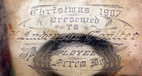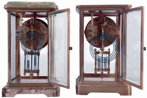 (1) Polished brass case in nice condition. Original porcelain dial is perfect. Original hands and pendulum. Beveled glass panels are perfect. (2) Brass and onyx case has a piece of the onyx missing at the back of the base. The top is detached from the case with some damage to one corner. Porcelain dial is perfect with loss of the name of the retailer. Original hands and pendulum. Beveled glass panels are fine. Engraved on the base reads: "Christmas 1907 / Presented to F. Anderson Coulter / By The / EMPLOYEES / Of The Screw Works"