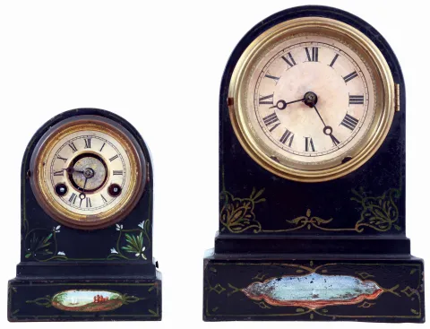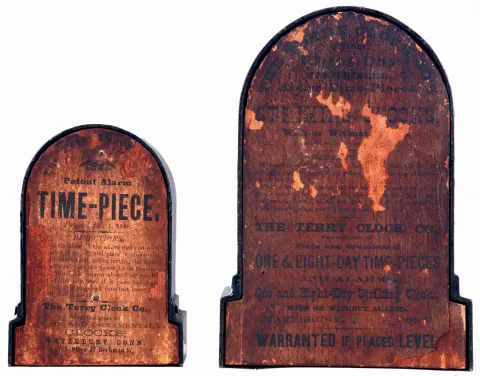 Clocks- 2 (Two): (1) Terry Clock Co., Waterbury, Conn., small iron case clock with a spring driven, 30 hours, time and alarm movement, c1870. (2) Terry Clock Co., Waterbury, Conn., larger iron case clock with a spring driven, 8 days, time and strike movement, c1870. (1) Case with gilt design and a small painted scene on front in excellent condition. Legible label on back. Paper dial and hands are original. Ht 6 ". (2) Case with gilt design and small painted scene on front in very good condition. Label on back has some loss but legible. Paper dial and hands original. Ht 8 3/4".