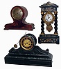 these good-quality clocks are mostly complete and in good condition, although the tambour needs hands. Sold as is with no further details available. Black marble clock, 21 1/2" wide, is very heavy and fragile for shipping.