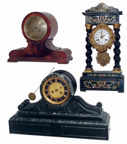 Clocks- 3 (Three) French, 8 days, time and strike mantel clocks: large marble; twist-column ebonized portico, and mahogany tambour, late 19th century these good-quality clocks are mostly complete and in good condition, although the tambour needs hands. Sold as is with no further details available. Black marble clock, 21 1/2" wide, is very heavy and fragile for shipping.