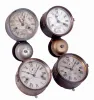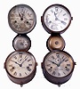 the brass case ship's bells clock retains most of its rear paper label but its case is tarnished and there is brass showing through part of its silvered dial. The second outside bell got wet and rusty, so is for parts only. The two time only clocks have tarnished but good cases, decent dials, but one is missing its seconds hand and has new brass grommets around its winding holes; the other has dark scratches around its winding holes. Sold as is, no further details available. All bezels are 6 1/4" diameter.