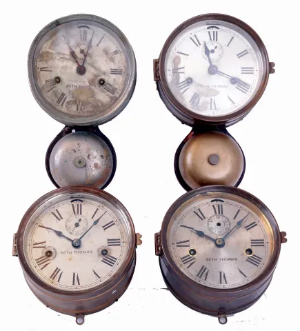 Clocks- 4 (Four) Seth Thomas brass case marine clocks: outside bell, 30 hours ship's bells; nickel plated outside bell, 30 hours ship's bells; 2 brass case, 8 days time only; all with wood back plates; late 19th, early 20th century the brass case ship's bells clock retains most of its rear paper label but its case is tarnished and there is brass showing through part of its silvered dial. The second outside bell got wet and rusty, so is for parts only. The two time only clocks have tarnished but good cases, decent dials, but one is missing its seconds hand and has new brass grommets around its winding holes; the other has dark scratches around its winding holes. Sold as is, no further details available. All bezels are 6 1/4" diameter.