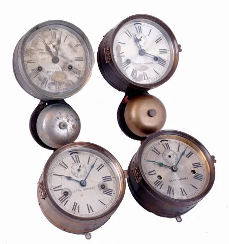 Clocks- 4 (Four) Seth Thomas brass case marine clocks: outside bell, 30 hours ship's bells; nickel plated outside bell, 30 hours ship's bells; 2 brass case, 8 days time only; all with wood back plates; late 19th, early 20th century