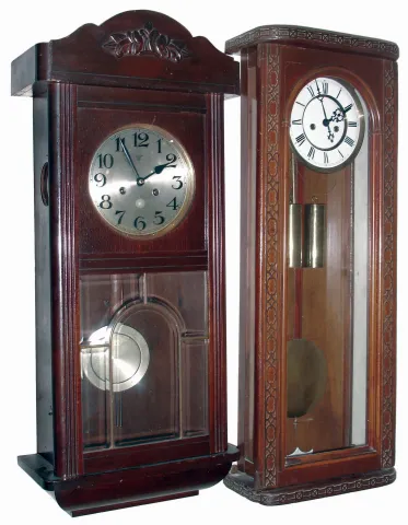 Clocks- 6 (Six), 8 days, time and strike, wooden case wall clocks, one also Westminster chime: 2 antique oak missions; Mauthe German box regulator; Waterbury 3 train; German Gustav Becker 2-weight flat top and bottom Vienna; Japan school clock; early 20th