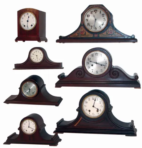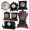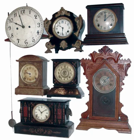Clocks- 14 (Fourteen): 10 Connecticut and German, 8 days wooden case mantel clocks; 3 Connecticut enameled iron, 8 days mantel clocks; one unsigned English, 8 days, 2 weight tall clock movement with dial and pendulum, Makers include Seth Thomas, New Haven, Gilbert, Ansonia, Ingraham, Hamburg-American. 19th and early 20th centuries all are in good condition with no major damage or losses, but sold as is with no further details available. Round dial of long case movement is 11" diameter