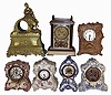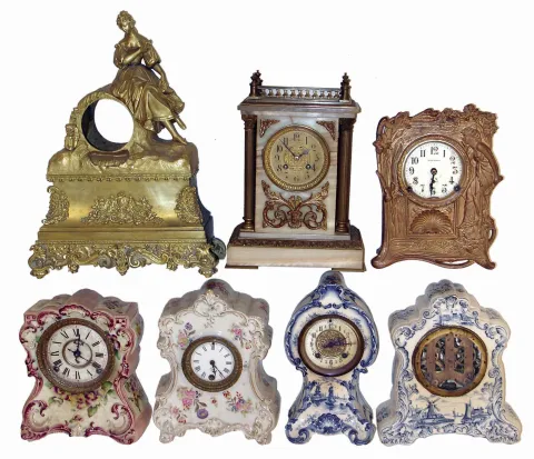 Clocks & Statues- 21 (Twenty-one): 4 cast metal seated figures; 1 French gilt metal case (no movement); 4 American porcelain case; 1 onyx French sold by Camerden & Forester, New York; Seth Thomas Art Nouveau metal case; 1 400 day; French marble with