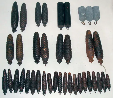 6 boxes with many useful cases, movements and parts, all later 20th century, which probably can be made into several complete clocks. Also crate of several pairs of cuckoo and other weights. Sold as is, no further details available