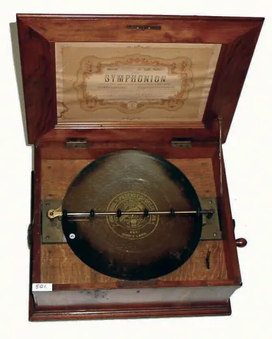Symphonion, Germany, "Style 30N" music box playing 13.6" disc in a plain sided walnut veneer box with "Symphonion Musical Automaton" incised with gold leaf on the lid, c1895, includes two discs the right comb is missing 2 teeth and the box plays well. At one time the box was changed from coin-op and there is a filled slot in the case front and the start stop lever is now on the inside of the box. The titles of the two discs are "Dixie" and "Stars and Stripes". For information on Symphonion, please see Bower's "Encyclopedia of Automatic Musical Instruments, page 218- 220. Width 20 1/4"
