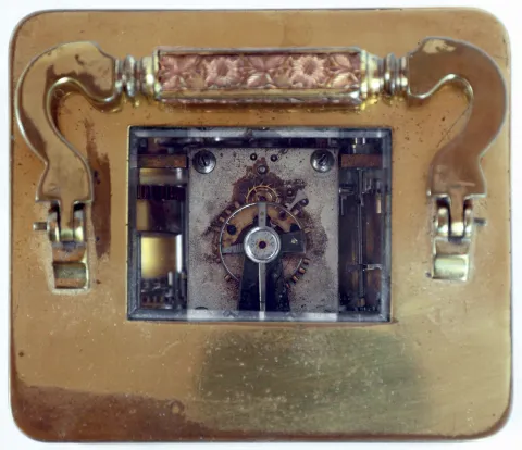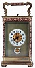 France, carriage clock, gilt brass case with applied foliate ornament, and five beveled glass panels, Arabic numeral white enamel alarm and time dials, each with gilt, ornamental center, and with a matte gilt mask, fancy blued steel hands, 8 days, time and strike movement with lever platform, announcing the hours and half hour on a coiled gong, and repeating the last hour on demand, c1900 case with losses to gilding, strip of applied ornament at base missing, glasses with some flakes/ chips, mask with minor discoloration, dials good, hands good, movement dirty, platform stained, and with loss to plating, ticking, repeating and alarm functional, needs service, Ht 7 1/2" to top of handle