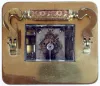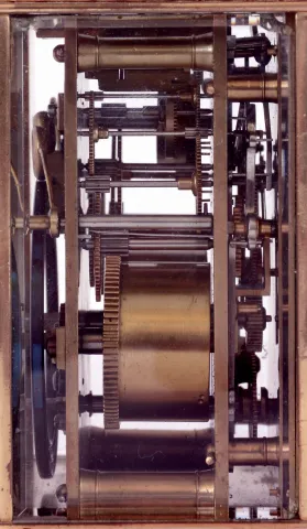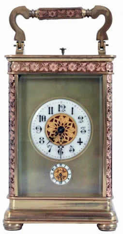 case with losses to gilding, strip of applied ornament at base missing, glasses with some flakes/ chips, mask with minor discoloration, dials good, hands good, movement dirty, platform stained, and with loss to plating, ticking, repeating and alarm functional, needs service, Ht 7 1/2" to top of handle