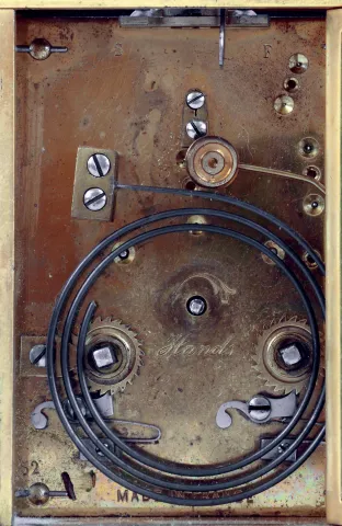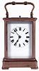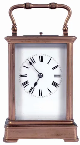 France, carriage clock, Corniche variant gilt brass case with five beveled glass panels, Roman numeral white enamel dial with blued steel spade hands, 8 days, time and strike movement with lever platform, announcing the hours and half hour on a coiled gong, and repeating the last hour on demand, c1900 case dirty, retains much of its gilding, glasses without damage, dial very good, hands original with a few specks of oxide, movement very dirty and oily, tries to run, needs service, repeating functional, Ht 7" to top of handle