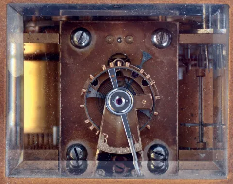 case dirty, retains much of its gilding, glasses without damage, dial very good, hands original with a few specks of oxide, movement very dirty and oily, tries to run, needs service, repeating functional, Ht 7" to top of handle
