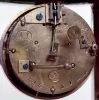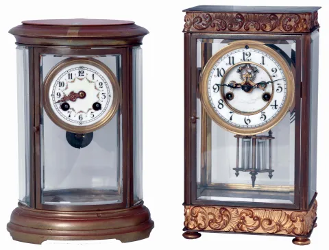 Oval brass case in need of a polishing. Unusual case in that it has top that lifts up to gain access to the interior screws or maybe to hide valuables. Original porcelain dial has a small chip on the edge at 9 o'clock. Original hands. All the beveled glass panels are fine. Replaced pendulum. (2) Brass case with some gilding remaining on the embossed top and bottom. Original porcelain dial has hairline scratches. Original hands and pendulum. The front and right side beveled glass panel is chipped. The other two glass panels are fine. Movement is signed.