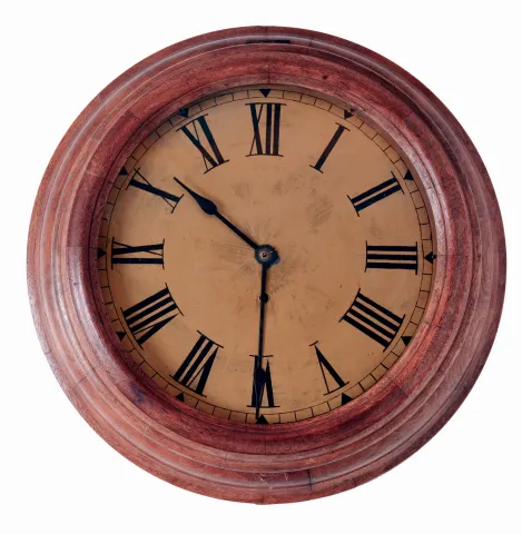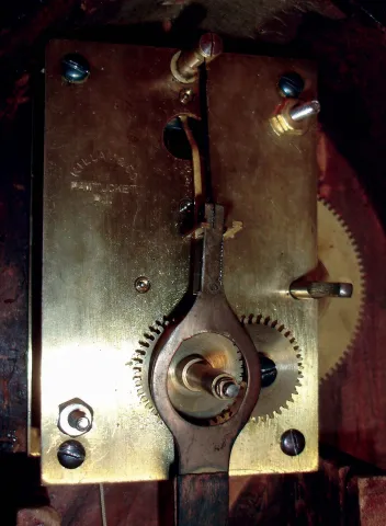 (1) Refinished walnut case in nice condition. The heavy metal dial looks original, but is now gold painted and will need to be restored. Period hands. Nice label in the back of the case. (2) Mahogany stained cherry case that has had a rough life, but restorable. Bottom door has a little damage on the top molding and has poor glue repairs to mitered corners. Dial door has been broken in a couple of places and repaired. Side arms are not original. Movement now held in the case with long machine screws. Painted metal dial is period with loss at the mounting screws. Dial does not fit on the head properly because the movement needs to be repositioned. Bottom tablets are old and possibly original as Killam was in business from 1902-16. Hands are not original.