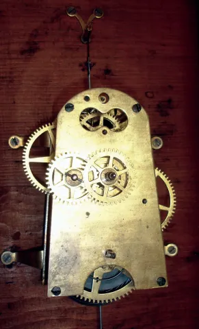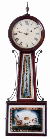 Clocks- 2 (Two): (1) Jerome & Co.,(New Haven Clock Co.), New Haven, Conn. "The gallery Timepiece", 8 days, spring driven brass movement 14" dial gallery, c1895. (2) Killam & Co., Pawtucket, RI, 8 days, brass weight driven banjo timepiece, c1910.