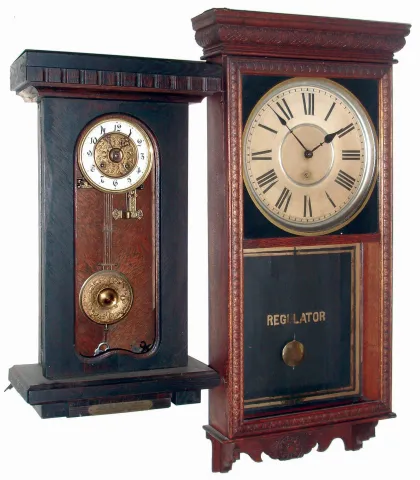 most are in old, worn, original condition but sold as is with no further details available. The OG has no weights included. The German wall clock has no front glass, and the oak Sessions lower glass tablet is detached. Ht of Sessions is 38"f