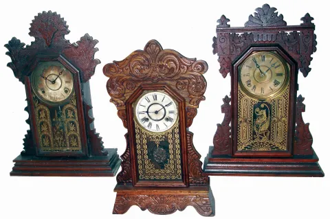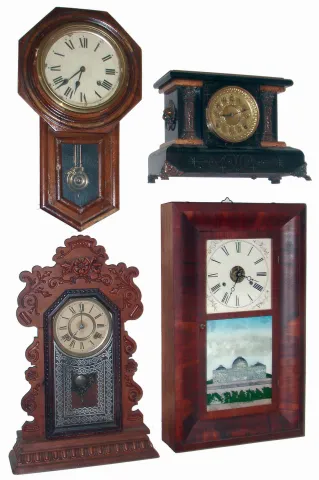 Clocks- 9 (Nine) wooden case mantel, shelf and wall clocks: 4 Connecticut, 8 days, time and strike gingerbreads (Ansonia, Gilbert, Ingraham); Jerome & Co., 30 hours, time and strike OG; Japan time and strike, 8 days school clock; Seth Thomas Adamantine, 8 days, time and strike mantel; German time and strike, 8 days, dark oak with 1907 presentaton plate; and Sessions time only, 8 days store regulator; late 19th and early 20th centuries most are in old, worn, original condition but sold as is with no further details available. The OG has no weights included. The German wall clock has no front glass, and the oak Sessions lower glass tablet is detached. Ht of Sessions is 38"f