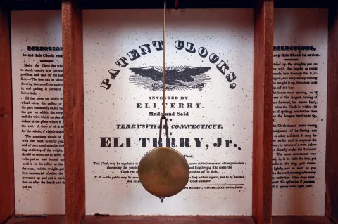 American, 30 hour, time and strike, weight wood movement in curly maple pillar & scroll case.