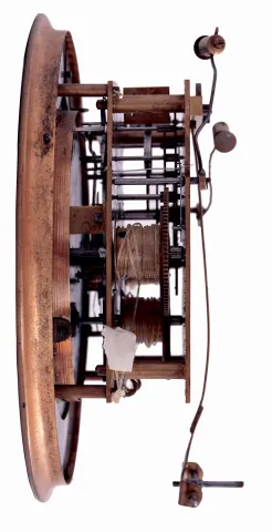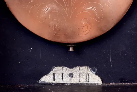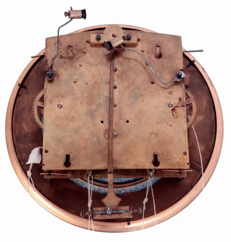movement is from another clock, filled corbel holes, and case back has been sprayed flat black. Outer case has been painted with heavy black paint and rubbed to gloss, but there is some orange peel and imperfections. Strike hammers have been soldered to their hubs. Movement restrung with gut, and does run and go through proper strike sequence. Hammers do not currently hit the rods. One weight does not match. Left side glass loose. Engraved bob, weights smooth. Ht 41"