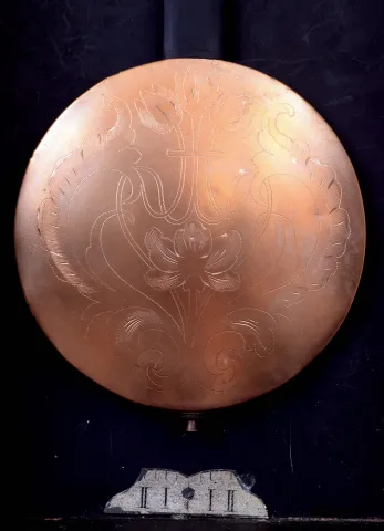 Austrian, 3-weight, Grand Sonnerie, Vienna Regulator, in a dark serpentine case with 2 gilt finials, striking quarter hours on two long steel rods at top of case, c1870, with restorations. movement is from another clock, filled corbel holes, and case back has been sprayed flat black. Outer case has been painted with heavy black paint and rubbed to gloss, but there is some orange peel and imperfections. Strike hammers have been soldered to their hubs. Movement restrung with gut, and does run and go through proper strike sequence. Hammers do not currently hit the rods. One weight does not match. Left side glass loose. Engraved bob, weights smooth. Ht 41"