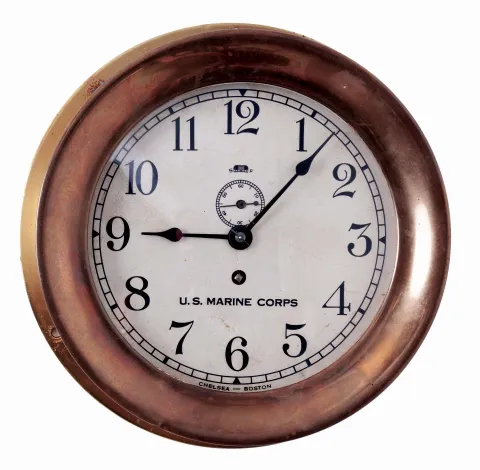 Chelsea Clock Co., Boston, Mass., 8 days, spring brass lever movement wall timepiece with a screw bezel, serial #19707, c1906 Polished brass case with a screw on bezel has a small ding on the edge and scratch marks on the back edge screw holes. Original silvered dial is pretty good for its age with a couple scratches and lightly soiled areas. Original hands. Lever movement is nickel plated. These pre-WWII timepieces were originally sold in nickel-plated cases and during the war offered in Phenolic cases. This example over time must have lost its nickel plating and is now polished brass. Ht 7 1/2"